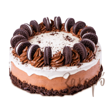 Шоколадов кексов блат с млечно-шоколадов мус с лешников тахан и нежен портокалов мус, цели лешници в пълнежа, с шоколадова глазура и украса от карамелизирани лешници и френски макарони.
