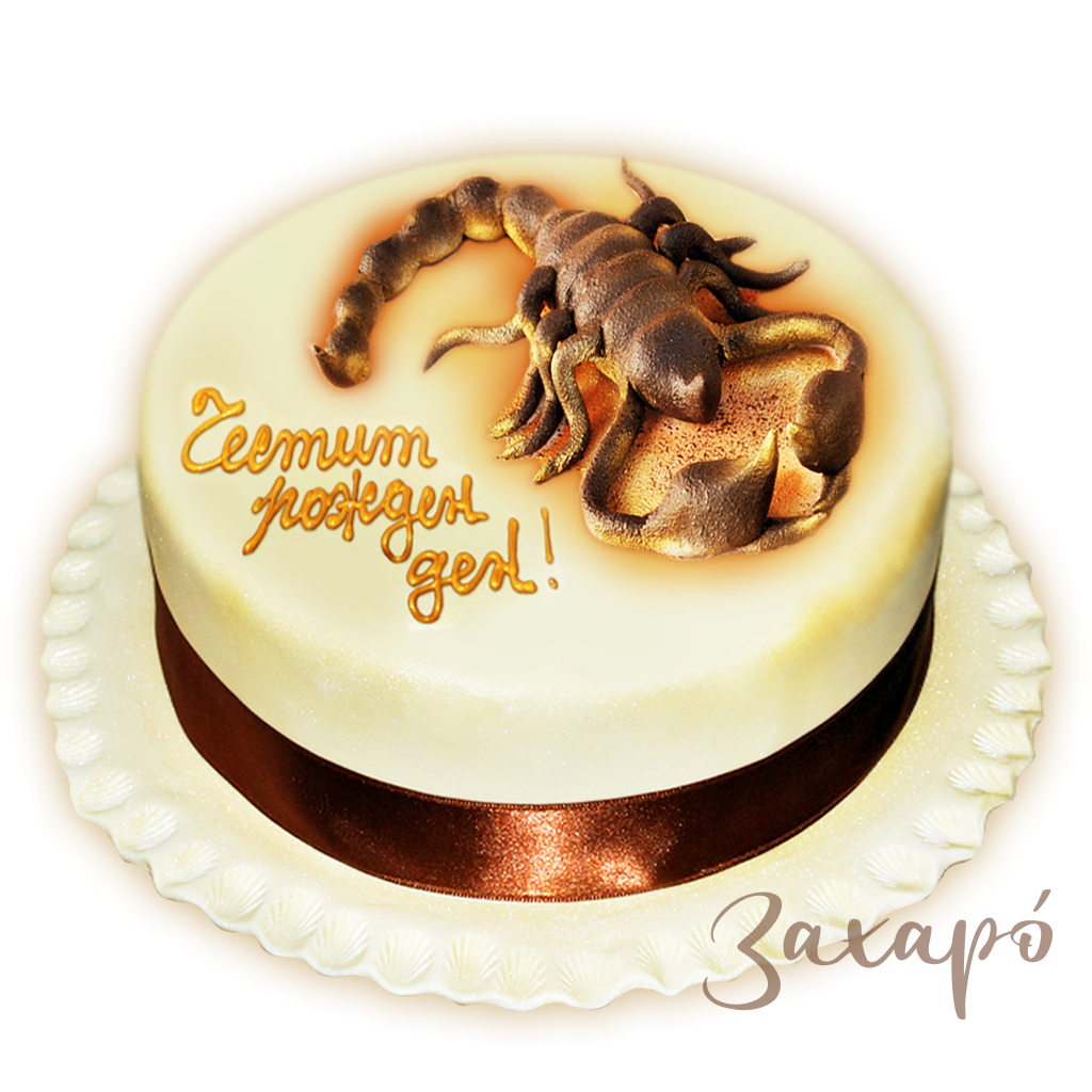 Торта във форма на Маргарита с с фонданово покритие - мека захарна маса, която й придава перфектен завършен вид и фонданова фигура на скорпион.