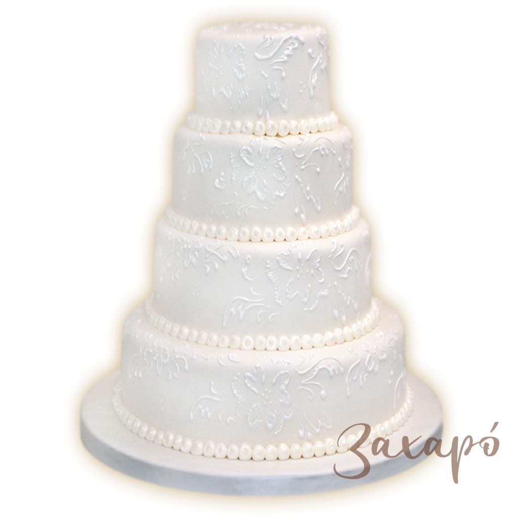 Торта на 4 етажа с бяло фонданово покритие и с рисунък от декоратор.