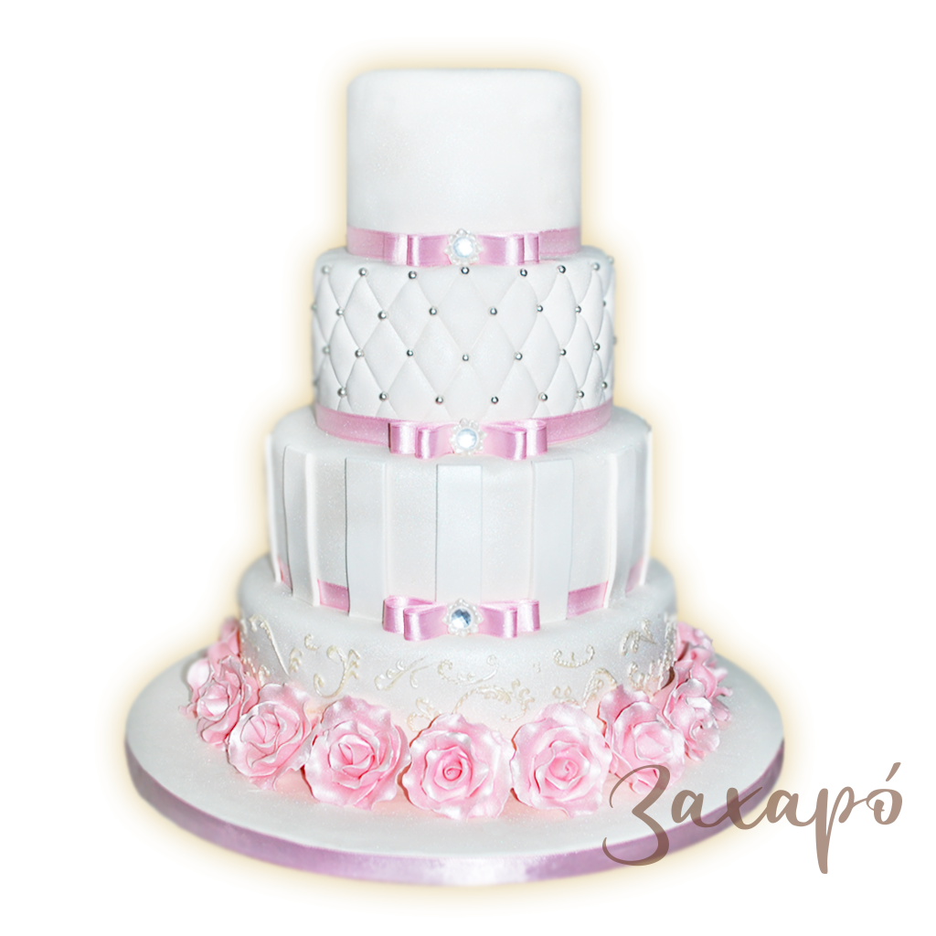 Торта на 4 етажа с бяло фонданово покритие и украса в бяло и нежно розово.