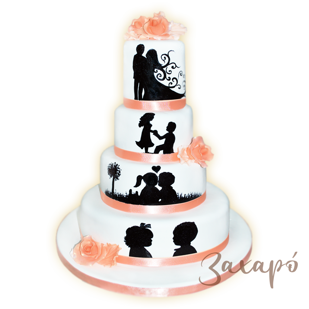 Торта на четири етажа с бяло фонданово покритие и украса от рисувани силуети.